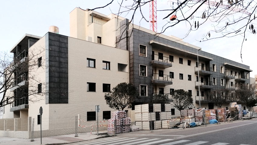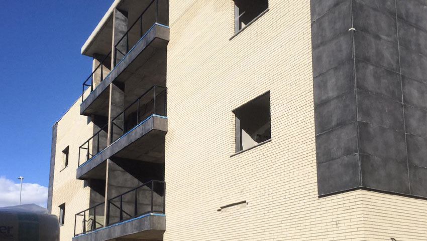 • Separación entre viviendas y zonas comunes con fábrica ½ pie de ladrillo macizo perforado, enfoscado de mortero de cemento a ambas caras y trasdosado interior de vivienda formado por dos placas de 13 mm. y estructura de perfiles de chapa de acero galvanizado de 48 mm. con aislamiento interior.
